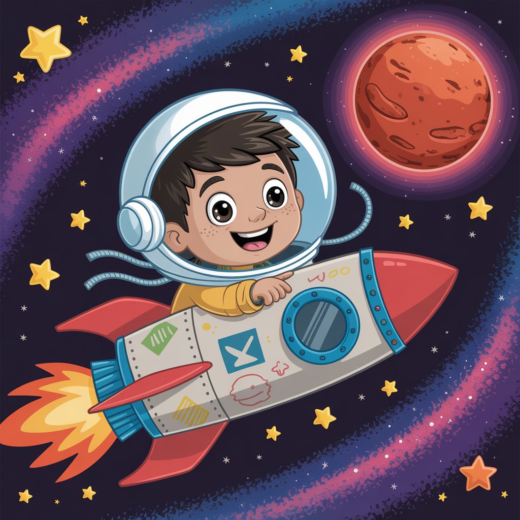 Soudain, la fusée se mit à trembler doucement. Vroum ! Les murs de sa chambre s’effacèrent pour laisser place à un ciel immense, noir et scintillant. Iyad n’avait pas peur, il riait aux éclats ! Sa fusée fila droit vers les étoiles, laissant une traînée d’étincelles derrière elle.