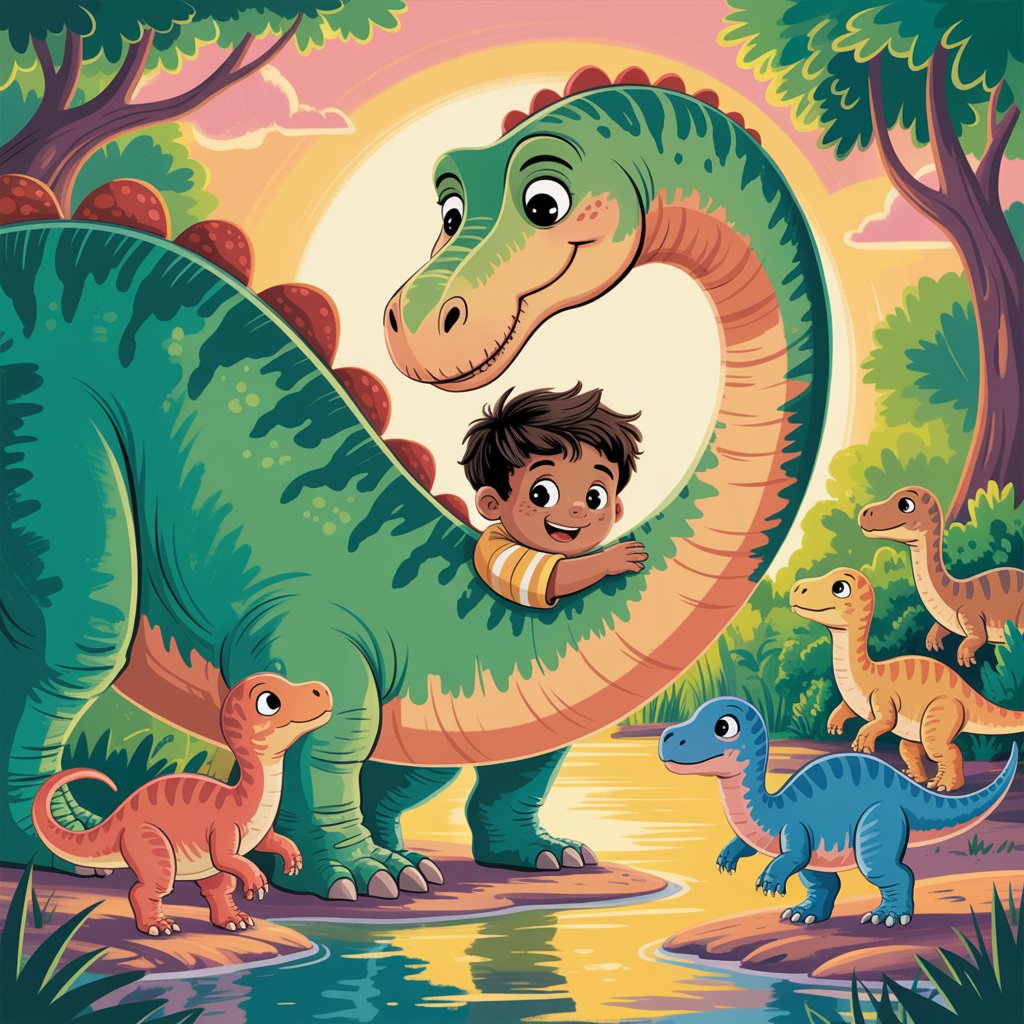 Ils arrivèrent près d’une rivière étincelante où tous les bébés dinosaures jouaient à s’éclabousser. Iyad glissa du dos de Dino-Doux et rejoignit la fête. Il courut avec les petits dinosaures, riant aux éclats. C’était le meilleur après-midi de sa vie.